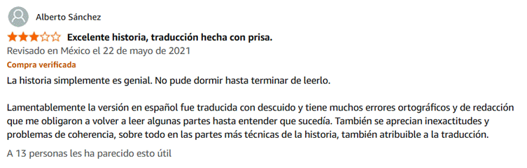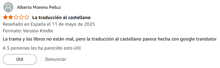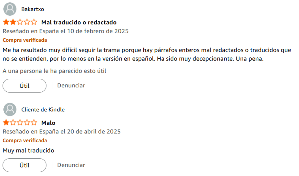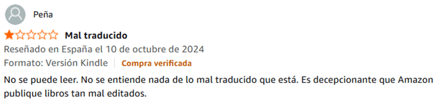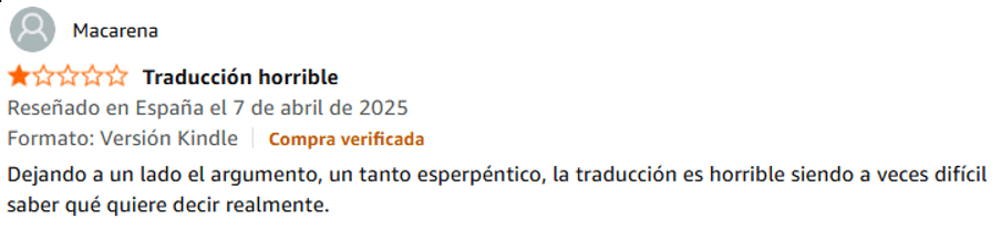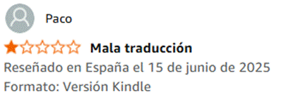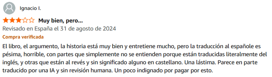 Cada vez es más común ver en Amazon libros autopublicados pagando por publicidad y, sin embargo, con traducciones desastrosas hechas por una IA. Basta leer algunas reseñas de lectores reales que se quejan de que se encuentran con párrafos incompletos, frases sin sentido e incluso capítulos enteros sin traducir. Te dejo ejemplos de capturas de pantalla de reseñas en Amazon España de lectores reales:
