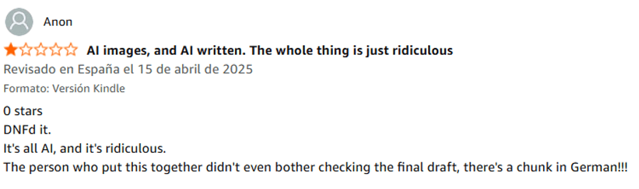 La que pongo a continuación es una reseña negativa de una traducción con la IA de alemán a inglés en el que se dejaron una parte incluso sin traducir. El lector o lectora, con un enfado monumental (con razón) se queja de que es pura IA y que el libro ni siquiera se revisó una vez, ya que tiene partes que siguen en alemán: