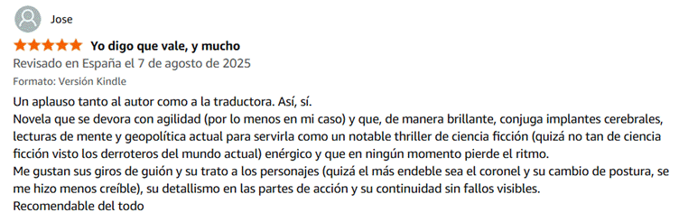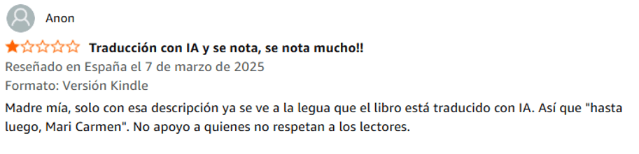 Sinceramente, cuando me encuentro en Amazon una novela traducida con la IA que tiene muchísimos comentarios positivos y luego uno o dos negativos en los que lo mencionan, las únicas reseñas que me parecen sinceras son estas últimas. Y dudo entre si las de cinco estrellas son reales o compradas. O si a la gente ya no le importa la calidad de los libros que lee… Lo que ya me preocupa de verdad.